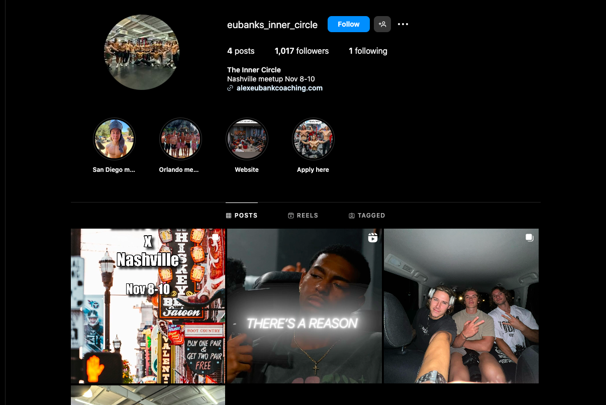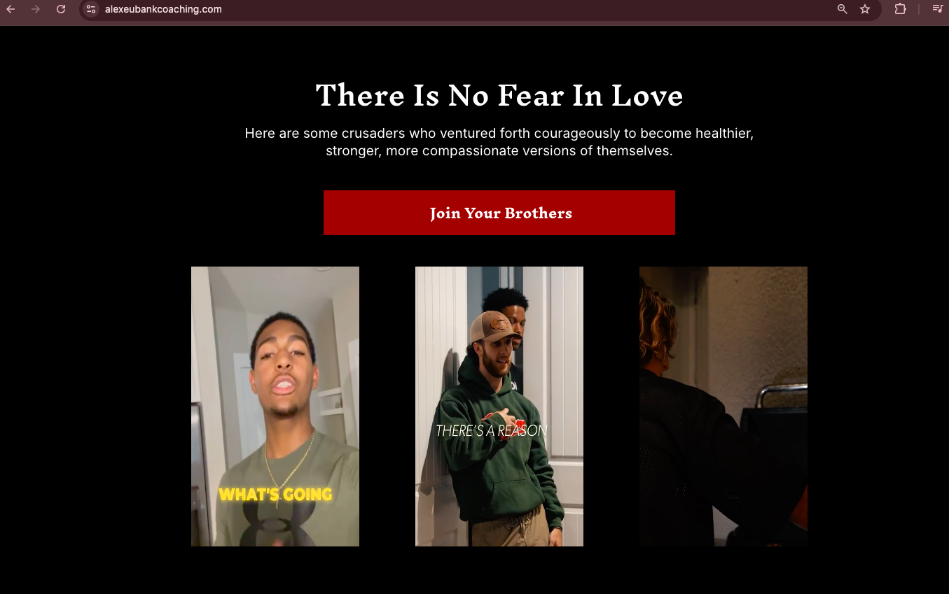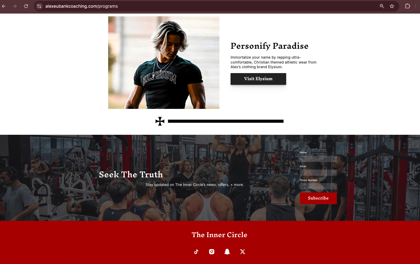 Famous fitness influencer Alex Eubank needed a website to promote his exclusive program dubbed “The Inner Circle.” We were tasked with copywriting, graphically designing, and developing a website that would speak to his massive following of like-minded individuals. Through health-based language, appeals to religion, and themes of group inclusivity, we were able to create a site that emphasized the program’s values of faith, fitness, and freedom: https://alexeubankcoaching.com/